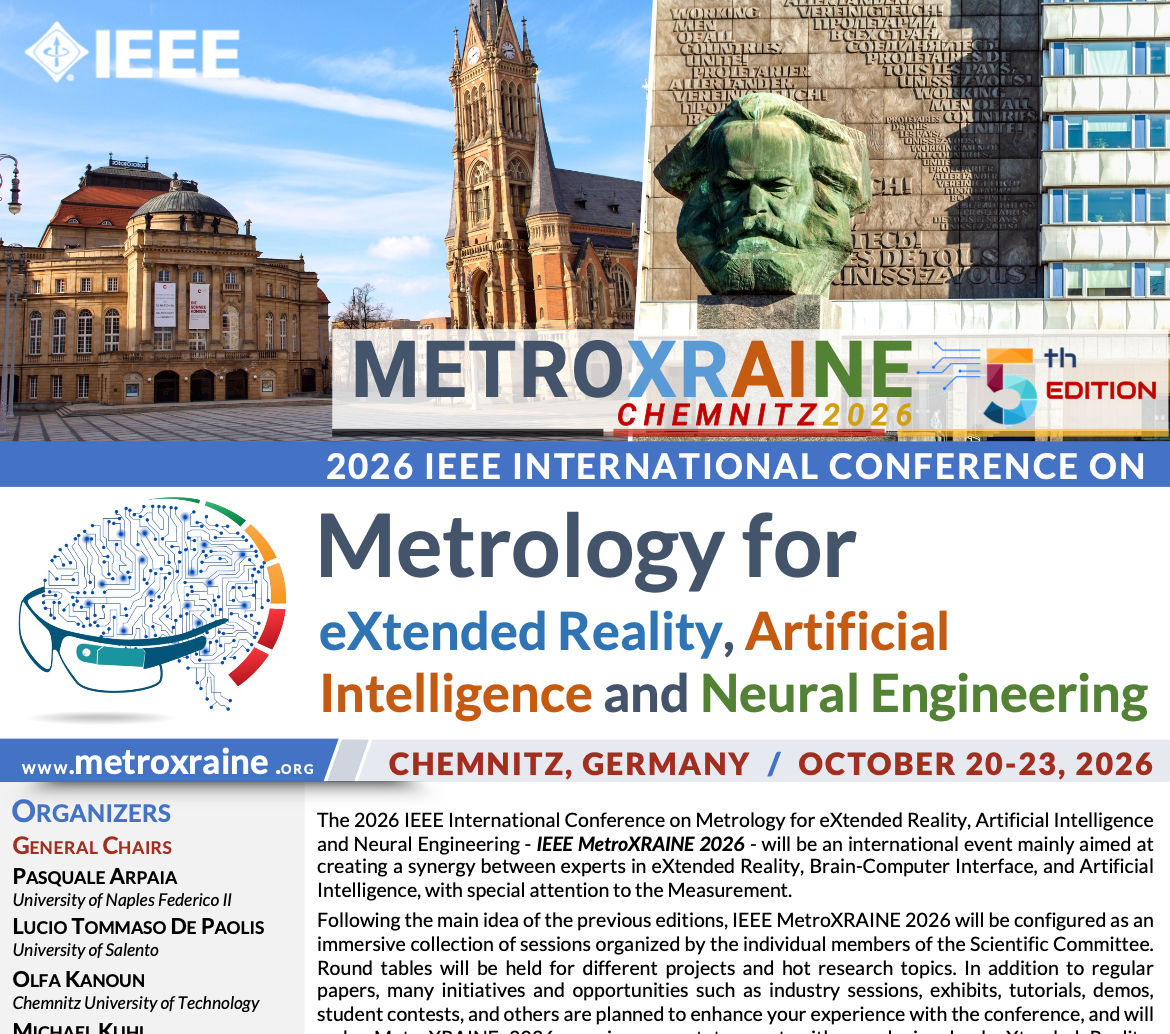 Following the main idea of the previous editions, IEEE MetroXRAINE 2026 will be configured as an immersive collection of sessions organized by the individual members of the Scientific Committee. Round tables will be held for different projects and hot research topics. In addition to regular papers, many initiatives and opportunities such as industry sessions, exhibits, tutorials, demos, student contests, and others are planned to enhance your experience with the conference, and will make MetroXRAINE 2026 a unique event to meet with people involved eXtended Reality, Artificial Intelligence, and Neural Engineering.