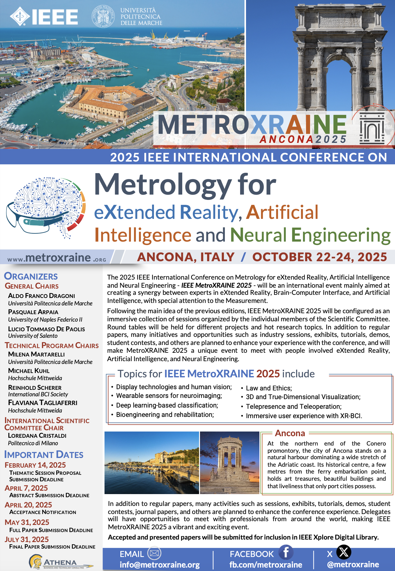 Following the main idea of the previous editions, IEEE MetroXRAINE 2025 will be configured as an immersive collection of sessions organized by the individual members of the Scientific Committee. Round tables will be held for different projects and hot research topics. In addition to regular papers, many initiatives and opportunities such as industry sessions, exhibits, tutorials, demos, student contests, and others are planned to enhance your experience with the conference, and will make MetroXRAINE 2025 a unique event to meet with people involved eXtended Reality, Artificial Intelligence, and Neural Engineering.