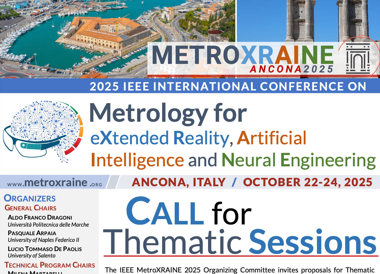 The IEEE MetroXRAINE 2025 Organizing Committee invites proposals for Thematic Sessions on new or emerging topics in metrology for extended reality, artificial intelligence, and/or neural engineering that have the potential to have a major impact on the field in the near future.