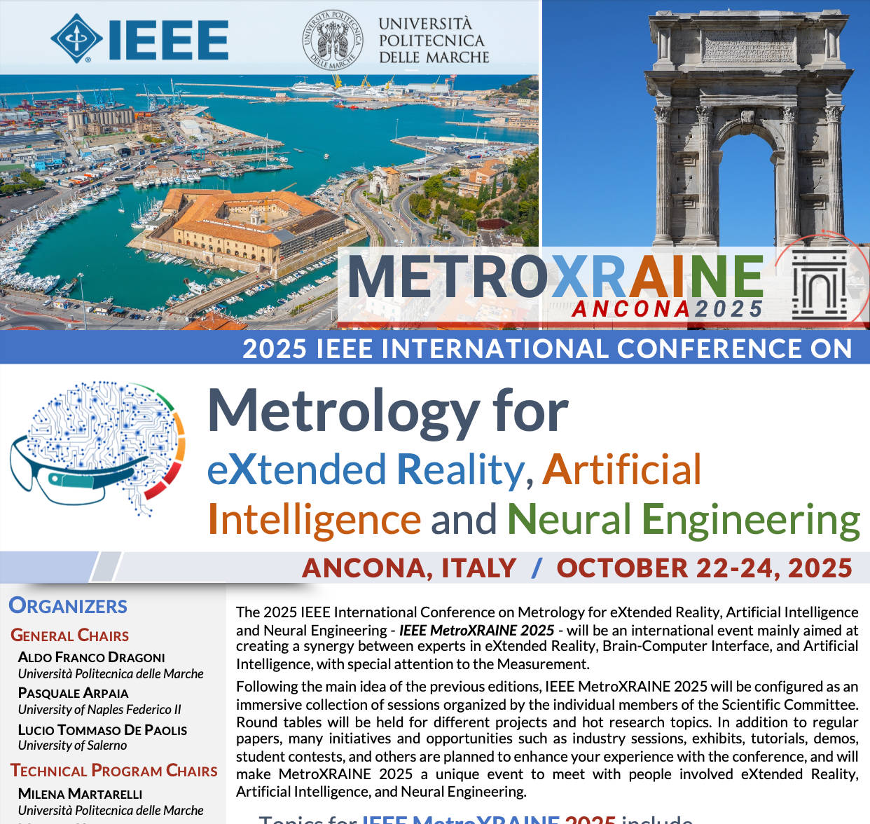 Following the main idea of the previous editions, IEEE MetroXRAINE 2025 will be configured as an immersive collection of sessions organized by the individual members of the Scientific Committee. Round tables will be held for different projects and hot research topics. In addition to regular papers, many initiatives and opportunities such as industry sessions, exhibits, tutorials, demos, student contests, and others are planned to enhance your experience with the conference, and will make MetroXRAINE 2025 a unique event to meet with people involved eXtended Reality, Artificial Intelligence, and Neural Engineering.