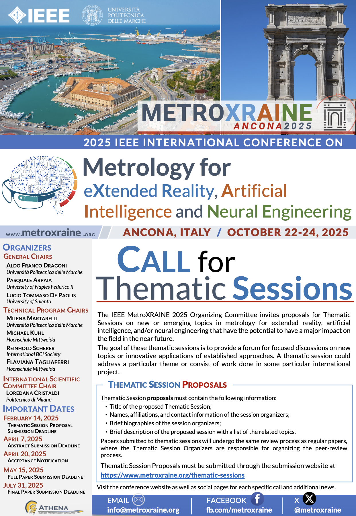The IEEE MetroXRAINE 2025 Organizing Committee invites proposals for Thematic Sessions on new or emerging topics in metrology for extended reality, artificial intelligence, and/or neural engineering that have the potential to have a major impact on the field in the near future.